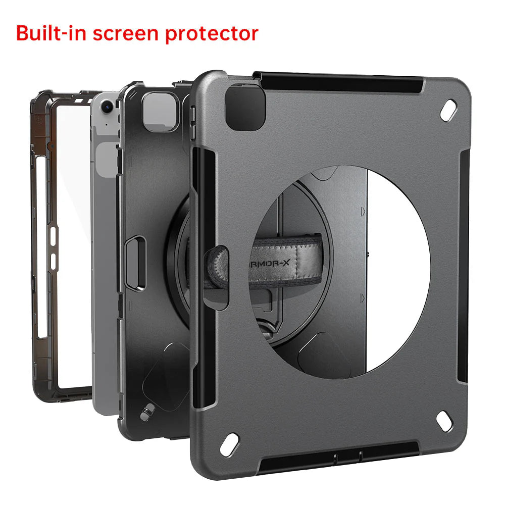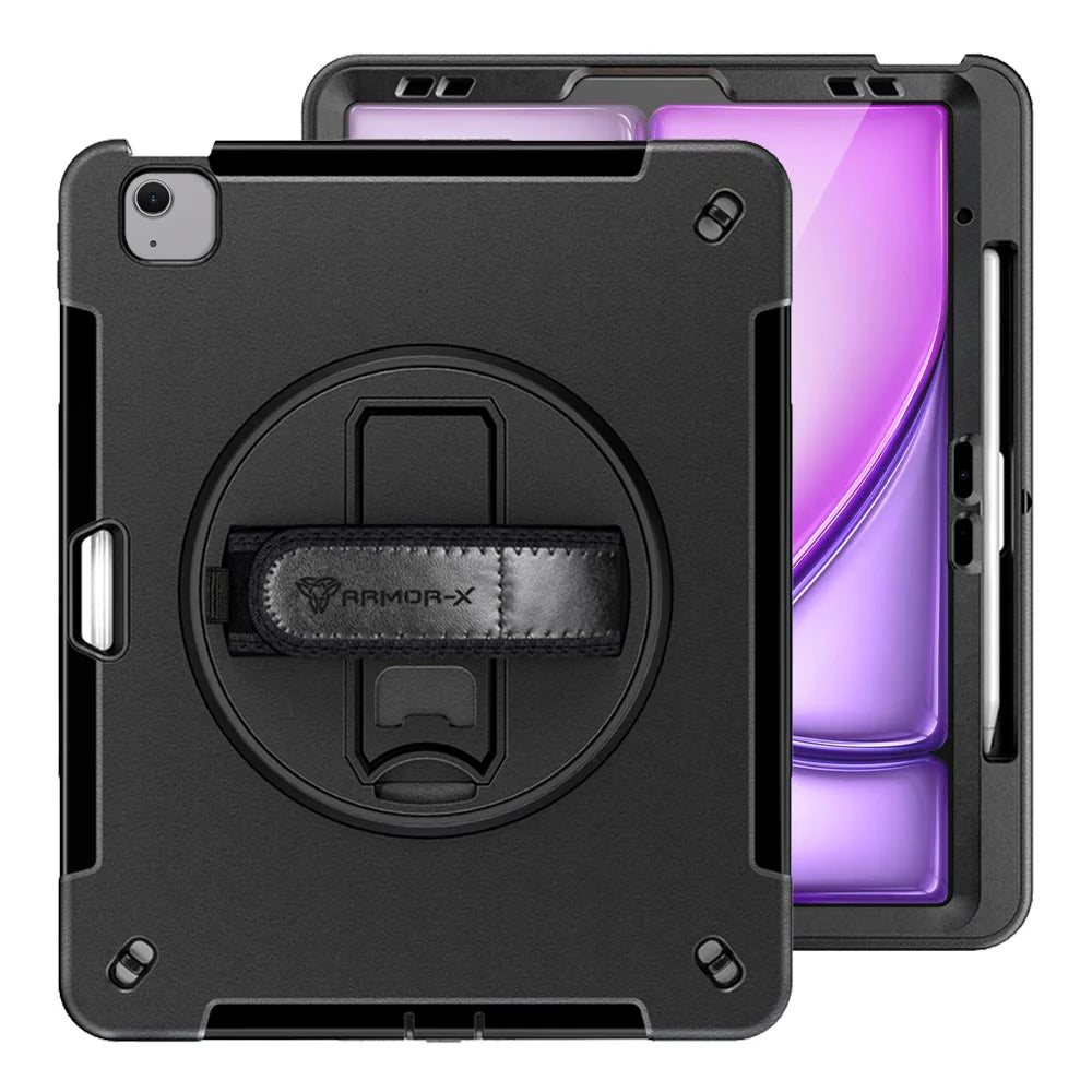 RIN-iPad-A6 | iPad Air 13 ( M2/M3 ) | Rainproof military grade rugged case with hand strap & kick-stand (built-in screen protector)